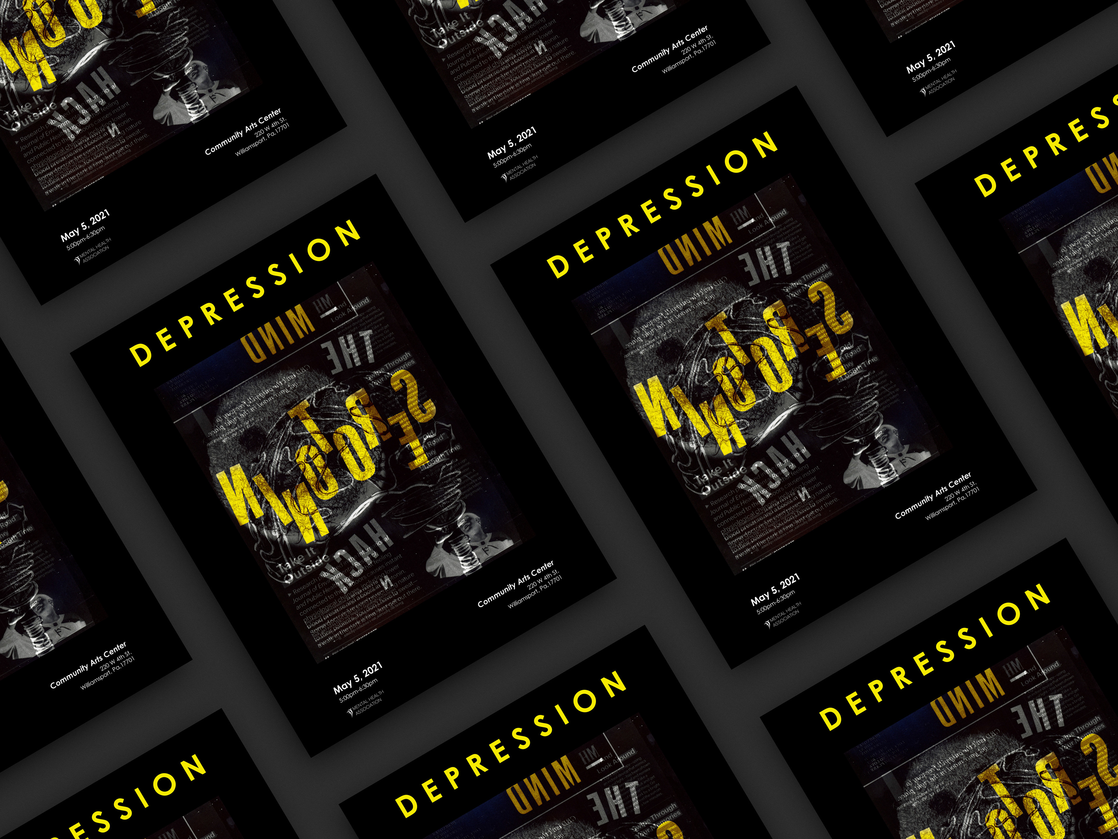 The Community Arts Center is having a talk about depression. The job is to make a poster that will catch people's attention as they walk by. The imagery must include the Heineken image made in the dark room.